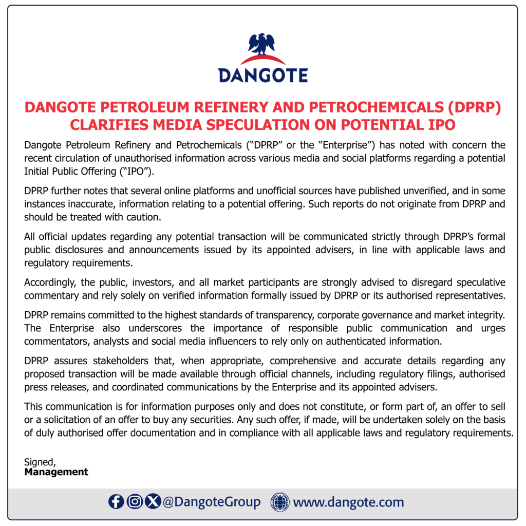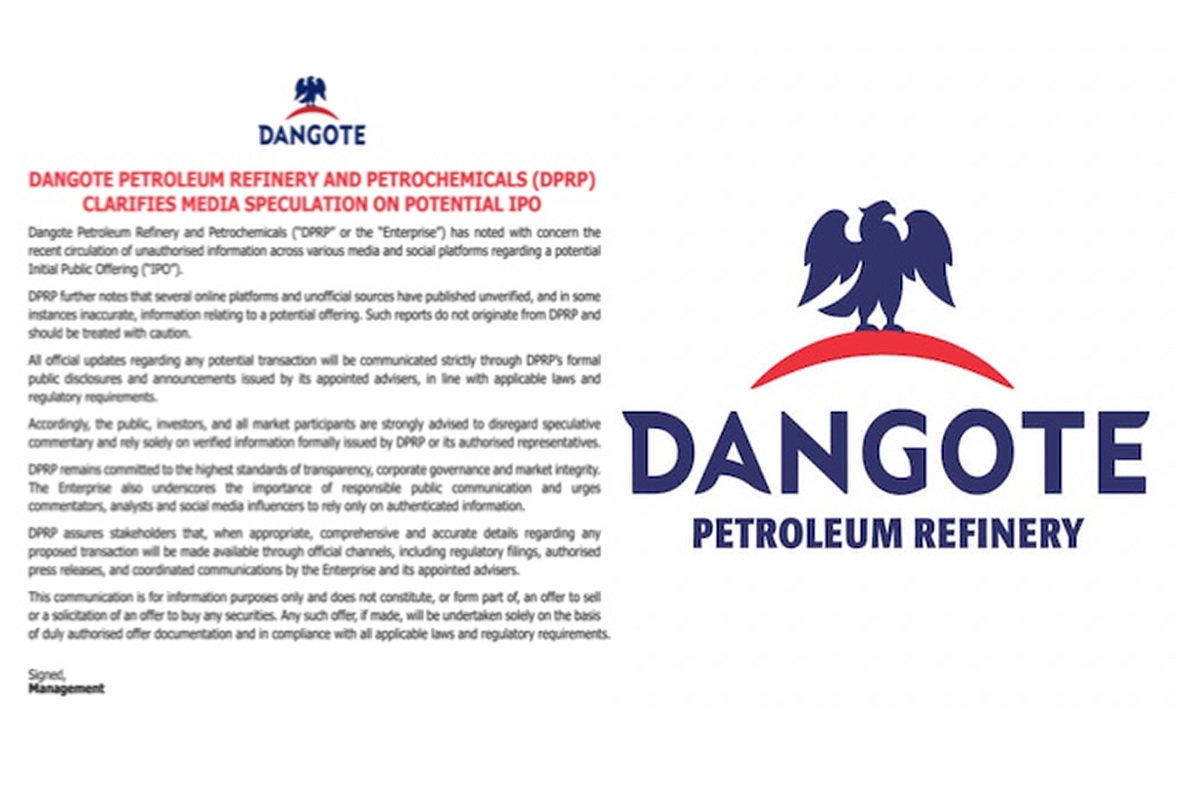 Dangote Petroleum Refinery and Petrochemicals (DPRP) has raised concerns over the circulation of unauthorised information across media and social platforms regarding a potential Initial Public Offering (IPO).